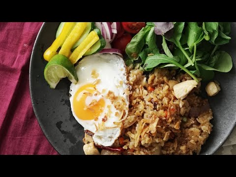 【ササッと作れる】ピリ辛ナシゴレン ■材料 ご飯(固め炊き)200g 鶏胸肉(1.5cm角に切る) 50g エビ 5尾 人参(5mm角に切る) 1cm分 紫タマネギ(1cm角に切る) 30g インゲ...